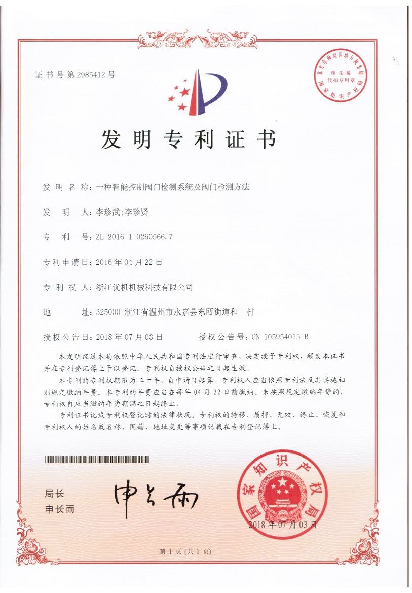 今年4月浙江優機機械(xie)科(ke)技(ji)有限公司《一種閥門檢測設備》發明(ming)專(zhuan)利,獲得(de)國家知識產權局授權。捷報連(lian)連(lian)該公司16年(nian)申(shen)請的(de)一(yi)種智能(neng)控制閥門檢測系統及(ji)檢測方法已在2018年7月03日授權(quan)公告(gao),公告(gao)號(hao):CN105954015B發(fa)明(ming)專利號:ZL 2016 1 0260566.7